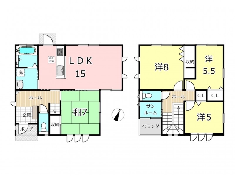 備考 【間取】1階:LDK15、和7、洗面、浴室、トイレ/2階:洋8、洋5.5、洋5、サンルーム、トイレ、ベランダ