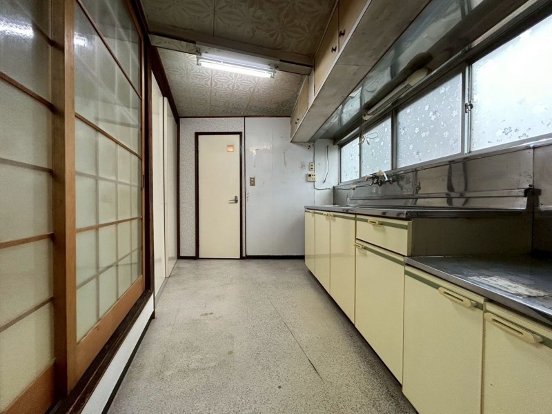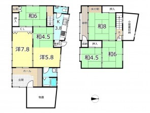 【間取】1階:キッチン3.8、洋7.8、洋5.8、和6、和4.5、洗面、浴室、トイレ、物置/2階:和8、和6、和4.5、小屋裏収納、縁側 ●築年数不詳(昭和27年7月以前の建物) ●登記上は居宅店舗 ●外壁・屋根・お風呂などリフォーム歴あり ●建具等一部不具合あり ●建蔽率超過 ●北西側道路はセットバック不要 ●解体渡し相談可 |