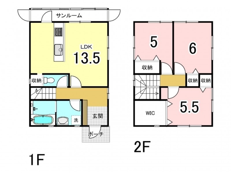 備考 【間取】1階:LDK13.5、洗面、浴室、トイレ、サンルーム/2階:洋6、洋5.5+ウォークインクローゼット、洋5