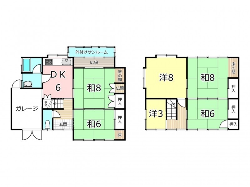 【間取】1階:DK6、和8、和6、洗面、浴室、トイレ、ガレージ/2階:洋8、洋3、和8、和6 ●リフォーム歴:2023年 給湯器交換,、2026年1月 屋根修理 ●現状渡し |